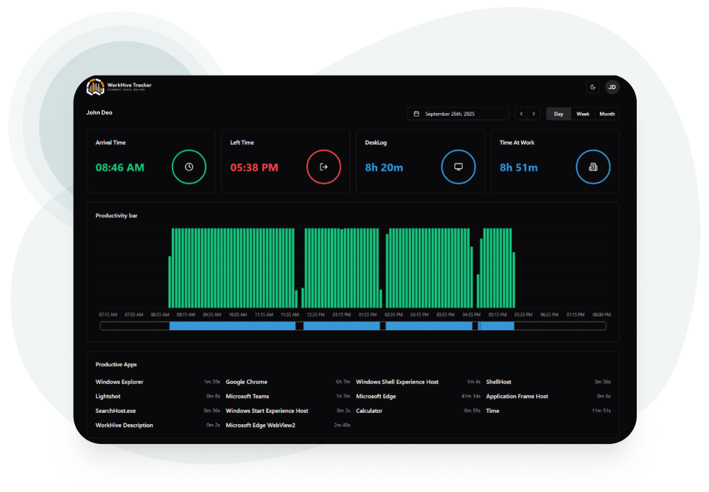 WorkHive tracks active work automatically in the background, capturing hours and productivity without manual input